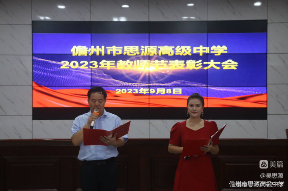 金秋颂桃李 丹心铸师魂 儋州市思源高级中学 庆祝第39个教师节暨表彰大会 TEACHERS DAY 教师节快乐 2023.09.10 春风化雨,润物无声育桃李;秋意深深,佳节将至颂师恩。为了进一步营造尊师重教的氛围,弘扬无私奉献的良好风尚,总结工作成绩,表彰先进典型,动员全体教师切实增强荣誉感、责任感、使命感,积极投身教育事业,努力办好人民满意的教育。在第三十九个教师节来临之际,9月8日下午,儋州市思源高级中学召开了2023年教师节庆祝暨表彰大会。 会议由谢可学老师和符露彩艺老师主持,共十四项议程。 01 党政办主任李敏宣读 儋州市思源高级中学 2022-2023学年度教职工表彰决定。 02 颁发优秀教师奖。 教学是一个学校的生命线,这些老师在教学上刻苦钻研、开拓创新,努力打造优质高效课堂,教学成绩显著。 03 优秀教师代表王冰分享经验。 04 颁发优秀班主任奖。 班主任老师是一个学校管理工作的主体,我校有着一个强有力的班主任团队。他们起早贪黑,披星戴月,迎着晨风,踏着夜色,匆匆来去。他们言传身教,既关心学生的学习,又关注学生的成长。 05 优秀班主任符晓玉分享经验。 06 颁发师德标兵奖。 07 颁发巾帼标兵奖。 08 颁发优秀职工奖。 09 颁发先进学科组长、备课组长奖。 10 先进备课组长代表余长财分享经验。 11 颁发教坛新秀奖、先进教育工作者奖。 12 颁发教坛新秀奖、先进教育工作者奖。 13 感动思源“十佳”代表刘东鑫发言。 14 刘凯锋校长总结发言。 我校党支部书记、校长刘凯锋发表了热情洋溢的讲话。刘校长从队伍建设、学生成长、教学质量、教育科研等方面对我校的教育教学工作进行了深入的分析和总结。他对全体教师提出殷殷期盼,希望所有老师立足教学,打造高效课堂,在教中研,在研中教。他号召全体老师用实际行动践行“学高为师,身正为范”。他的发言赢得全体老师经久不息的掌声。 春播桃李三千圃,秋来硕果满神州。新的学期已经开始,儋州市思源高级中学的全体教师将以更加坚定的信念,饱满的热情,求实的作风,投入到工作中,让学校实现新的跨越和辉煌! — END —